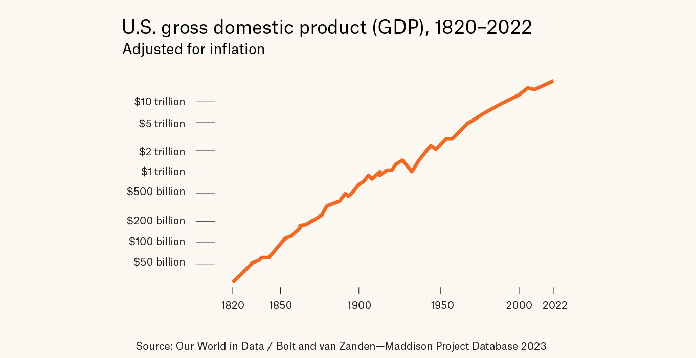 Through two world wars, the Great Depression, the global financial crisis, and the Cold War, US real GDP per capita has grown steadily at 2% per year. This consistency is remarkable, so much so that it has motivated economists to search for a near-immutable source of economic growth: something fundamental that drives growth across long sweeps of time. Sure, growth can be affected in the short run by policies and events of the day — tariffs, wars, demographic transitions, educational booms — but it would be an incredible coincidence if the combined impact of every economic policy and external event in history happened to net out as a constant growth rate! So what could this immutable mechanism be?
